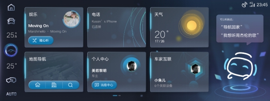 2021款爱驰U5可以实现语音控制车辆硬件、免唤醒语音控制、多轮对话、连续指令、语音闪念胶囊、自定义语音合成等功能,让人车交流更为便捷、智能。智能语音助手个性化自定义等功能更助力2021款爱驰U5突破出行工具属性,化身出行伴侣。
