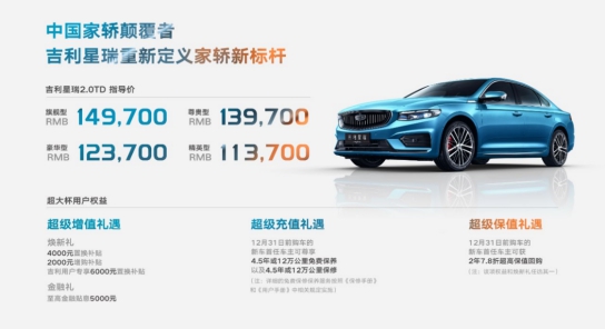 11月1日,吉利CMA超级母体首款宽体A级轿车——吉利星瑞于线上正式上市,新车全系标配2.0TD+7DCT黄金动力系统,共推出4款车型,官方指导价为11.37万-14.97万元。