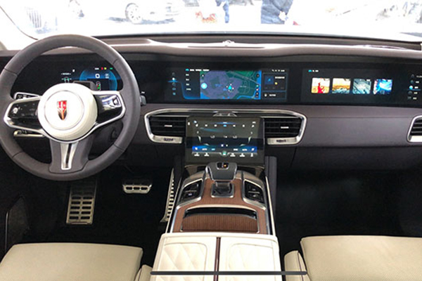 在内饰部分,红旗E-HS9的设计处处体现“中直尚雅”、“精工致作”、“山水意境”的东方美学。对称式的布局与故宫的中轴线设计一本同源。全液晶仪表盘、中控多媒体触控屏、副驾驶位眼睛显示屏的三联屏设计,再搭配中控中间的控制面板触摸屏,拥有四块可触摸大屏幕让整车的科技感十足。当然,在后排还有座椅屏和后排中央扶手大屏。七屏娱乐系统在体现出科技感的同时,也兼并了舒适与豪华。