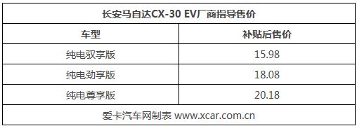 9月26日,长安马自达CX-30 EV正式上市,补贴后售价区间15.98-20.18万元。作为马自达在华推出的首款纯电车型,马自达CX-30 EV的NEDC续航里程450km。
