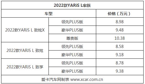 近日,我们从广汽丰田官方获悉,2022款YARiS L家族正式上市,其中YARiS L 致炫X提供3款车型,指导价格为8.98-10.38万元;YARiS L 致炫提供两款车型,指导价格为8.58-9.18万元;YARiS L 致享提供2款车型,指导价格为8.78-9.38万元。