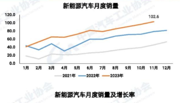 据中汽协数据显示,2023年11月,我国汽车产量创历史新高。汽车产销量分别完成309.3万辆和297万辆,同比分别增长29.4%和27.4%。其中,新能源汽车月度产销量首次双超百万辆,站上新台阶。11月,新能源汽车产销量分别完成107.4万辆和102.6万辆,同比分别增长39.2%和30%。