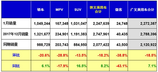 2018年1月我国狭义乘用车销量为2247639辆,同比增长8.2%,环比下滑18.2%。崔东树认为,今年1月份没有处于春节假期之中,有效销售日有所增加,因此汽车销量出现小幅增长。