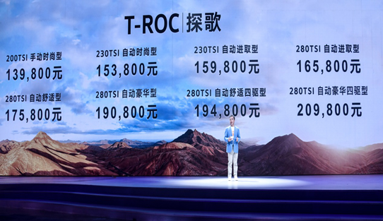 7月30日, 一汽-大众首款SUV——T-ROC探歌在深圳上市。新车提供200TSI、230TSI和280TSI三款动力选择,并提供四驱版本,共8款车型,售价区间13.98-20.98万元。