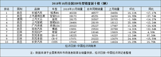 日系SUV的强势表现则在延续,10月仍有3车携手入榜,不过本月的“赢家”则成为了东风本田。在“机油门”阴影下低迷了数月的东风本田终于迎来曙光,10月,东风本田XR-V和CR-V携手入榜。其中,XR-V共销售18225辆,环比上涨12.24%,同比更是劲增97.26%,其排名也再升一名至第8名;而“机油门”的主角CR-V销量则回升至17071辆,虽同比仍有15.59%的跌幅,但环比大涨24.80%的走势也显示出了其触底快速反弹的走势。