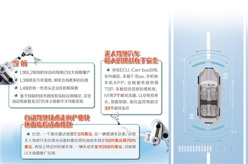 当前,L1和L2级别半自动驾驶已经大规模量产;L3级将在今年落地,明年会有更多应用;L4级也有一些龙头企业在积极探索。但是,针对“2030年左右就可实现无人驾驶产业化”的预测,专家则持谨慎态度。要真正实现完全意义上的无人驾驶,还面临着安全、成本等一系列难题,需要产业界和全社会合力推动解决。