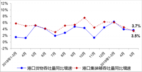 5月,全国港口完成货物吞吐量12.0亿吨,同比增长3.7%,其中内、外贸吞吐量分别增长5.2%和0.9%;完成集装箱吞吐量2240万标箱,同比增长3.5%。