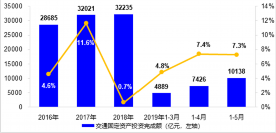 1-5月,交通固定资产投资完成10138亿元,同比增长7.3%,较去年全年加快6.6个百分点。公路水路完成投资7537亿元,同比增长4.8%,其中公路、内河、沿海分别完成投资7115亿元、215亿元和196亿元,同比分别增长4.5%、14.7%和8.1%。