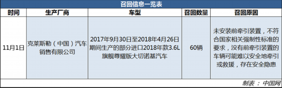 中国网汽车11月4日讯 近日,克莱斯勒(中国)汽车销售有限公司根据《缺陷汽车产品召回管理条例》和《缺陷汽车产品召回管理条例实施办法》的要求,向国家市场监督管理总局备案了召回计划。决定自11月1日起,召回2017年9月30日至2018年4月26日期间生产的部分进口2018年款3.6L旗舰尊耀版大切诺基汽车,共计60辆。
