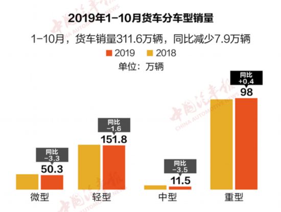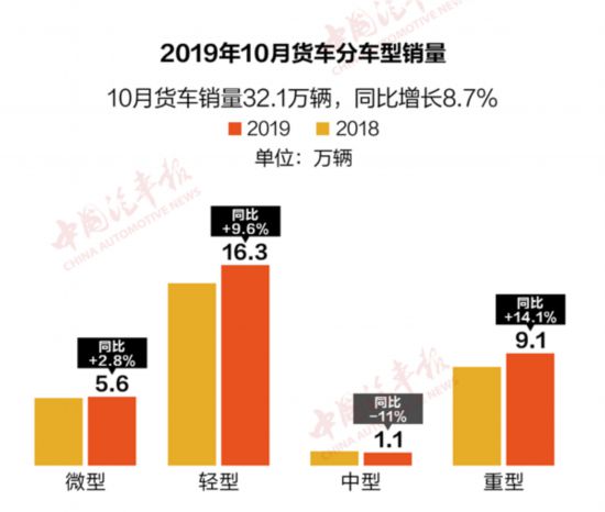10月整体汽车销量继续下滑,同比下降4%,在车市寒冬中,商用车回暖态势明显,在各地加快更新淘汰及投资拉动等因素的影响下,本月商用车继续保持较好的增长势头,涨幅与9月相比有扩大的趋势。