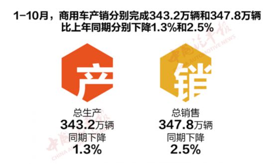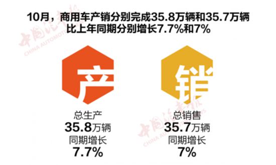 11月11日,中国汽车工业协会发布10月汽车产销数据。商用车产销分别完成35.8万辆和35.7万辆,比上月分别增长3.9%和4.8%,比上年同期分别增长7.7%和7%,与乘用车市场的“一片凉凉”相比,商用车产销数据表现亮眼,市场加速回暖。