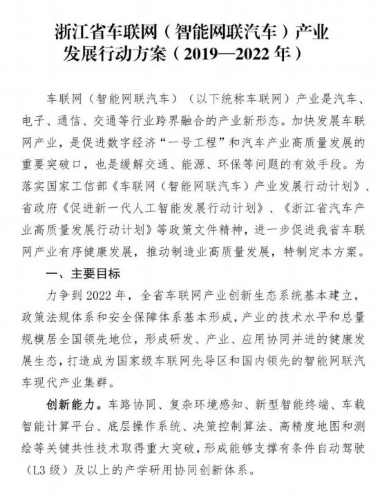 推动智能网联发展的,除了技术,还有政策。“加快发展智能网联产业,是促进数字经济‘一号工程’和汽车产业高质量发展的重要突破口,也是缓解交通、能源、环保等问题的有效手段。”近日,浙江省经济和信息化厅、科技厅、交通运输厅联合印发《浙江省车联网(智能网联汽车)产业发展行动方案(2019-2022 年)》(以下简称《方案》)中所指出的,正是发展智能网联的意义所在。