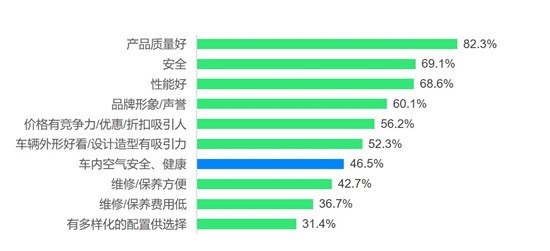 消费者前三大购车考虑因素是质量(82.3%)、安全(69.1%)和性能(68.6%),但疫情使车内空气安全和健康上升成为购车时的又一考量重点(46.5%)。