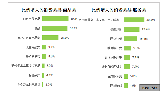 新冠肺炎疫情加速了日常生活类消费线上化。调查结果显示,与以往相比,受访者对日常生活商品和服务的线上消费类型变动较大。商品类消费中,59.4%的受访者表示日用百货类商品的线上消费占比增大,57.6%的受访者表示食品类商品的线上消费比例增大,36.8%的受访者表示医药及医疗用品类商品的线上消费比例增大。服务类消费中,线上消费比例增大排在前三的消费类型分别为公用事业类(水、电、气、暖等)、快递业务和网络订餐,占比分别为25.5%、19.4%和16.4%。可以发现,疫情期间日常生活类消费线上占比增加较多,这将促进日常生活类消费加速向线上消费方式转移。疫情期间医疗服务类线上消费增长明显,36.8%的受访者在医药及医疗用品类和5.0%的受访者在医疗服务类的线上消费比例明显增加。