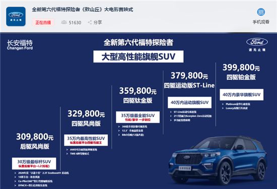 作为长安福特“大型高端旗舰SUV”,全新第六代福特探险者共推出5款车型,售价区间为30.98万-39.98万元,全系支持6座或7座布局选择。