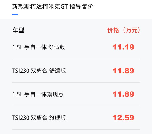 日前,我们从官方获悉,新款斯柯达柯米克GT正式上市,新车共推出4款车型,价格区间11.19-12.59万元。新车油箱容积与老款车型相比有所变化,全系均更换为52.8L油箱。