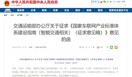 同日,交通运输部公开发函,广泛征求对《国家车联网产业标准体系建设指南(智能交通相关)(征求意见稿)》(以下简称《征求意见稿》)的意见。其中,对进一步明确标准制修订重点,以及形成统一、协调的国家车联网产业标准体系架构作出部署。