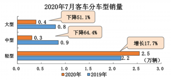 从细分车型来看,7月,大型客车销0.4万辆,环比下降37.7%,同比下降51.1%;1-7月,大型客车销2.7万辆,同比下降33.8%。中型客车销0.3万辆,环比下降27.0%,同比下降64.4%;1-7月,中型客车销2.0万辆,同比下降44.3%。轻型客车销2.5万辆,环比下降21.9%,同比增长17.7%;1-7月,轻型客车销17.0万辆,同比下降1.7%。