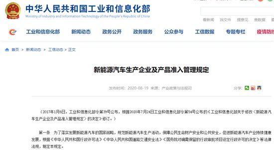 人民网北京8月20日电(王紫)19日,工信部正式发布了修改后的《新能源汽车生产企业及产品准入管理规定》(以下简称“规定”)。《规定》删除了包括第五条以及《新能源汽车生产企业准入审查要求》等附件中有关“设计开发能力”的相关内容;将新能源汽车生产企业停止生产的时间由12个月调整为24个月;删除了有关新能源汽车生产企业申请准入的过渡期临时条款。《规定》将自2020年9月1日起施行。