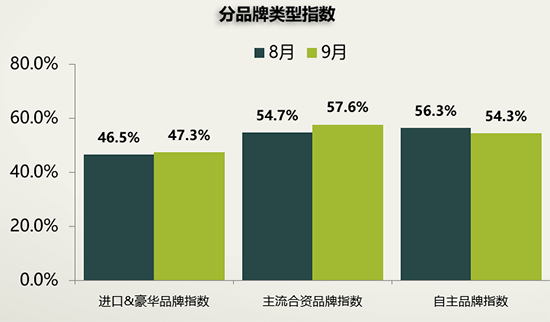 品牌类型方面,9月份进口&豪华品牌、主流合资品牌指数环比上升,自主品牌指数环比下降。樊宇表示,豪华品牌继续领跑,库存处于警戒线以下;合资品牌则出现明显的分化,库存压力上升;自主品牌市场份额小幅回升,销量稳定增长,库存压力得到一定缓解。