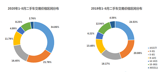 1-8月,全国二手车市场累计交易量811.47万辆,同比下降12.50%。其中,3万元及以下价格区间的车辆增长9.53%;3-5万区间增长1.70%;5-8万区间下降1.76%;8-12万区间下降1.69%;12-15万区间下降1.23%;15-30万区间下降4.71%;30万区间以上下降1.83%。