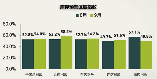 从区域情况来看,北区指数为58.2%,东区指数为54.2%,西区指数为51.6%,南区指数为49.8%,是唯一位于警戒线以下的区域。樊宇表示,临近四季度,经销商进入秋季补库周期,而南方地区的广东、湖南、湖北等省份销量增速较快,库存压力略有缓和。
