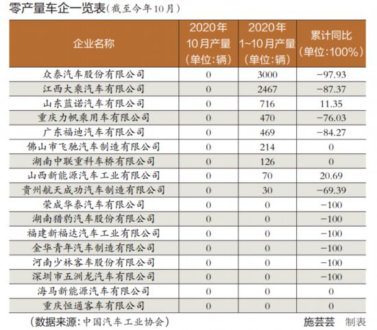 正如蔡荣华所言,我国汽车产销量占全球30%左右,企业竞争日趋激烈,但是盲目投资、产能利用率比较低的问题尚未得到有效解决。《中国汽车工业产销快讯》(2020年第11期)数据显示,在总共被统计的88家汽车企业中,今年10月汽车产量为零的汽车企业竟然多达17家(事实上,这一数据在8月为16家),今年前10个月产量低于500辆的共有25家,其中,有8家生产企业今年未生产过1辆汽车,占比接近一成。