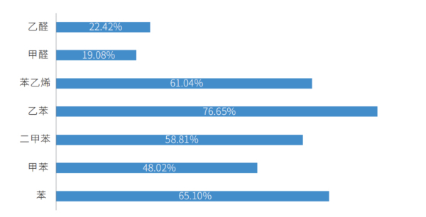 2022年度车内空气质量测评结果显示,常温状态下,除丙烯醛外,其余7种挥发性有机物均较2018-2021年有不同程度下降,一类致癌物甲醛和苯分别下降19.08%和65.10%,其余五种物质也分别有22.42%至76.65%的下降。