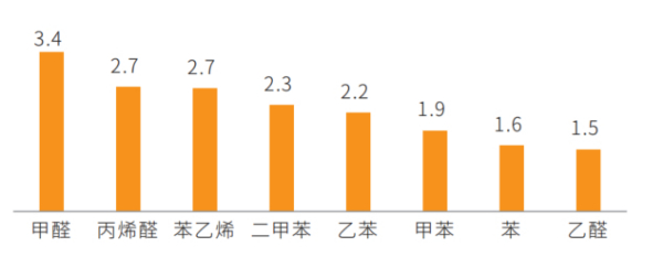 高温模式下的挥发性有机物测评结果不如人意,浓度平均为常温下的2倍。甲醛、乙醛、二甲苯和苯乙烯分别为常温模式的3.8倍、1.5倍、2.3倍和2.7倍。由此可见,消费者“温度越高,车里味道越大”的朴素感知与测试结果相符,高温下的车内污染问题亟待解决。