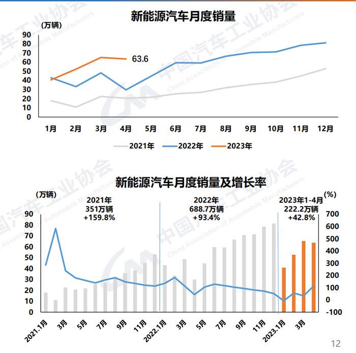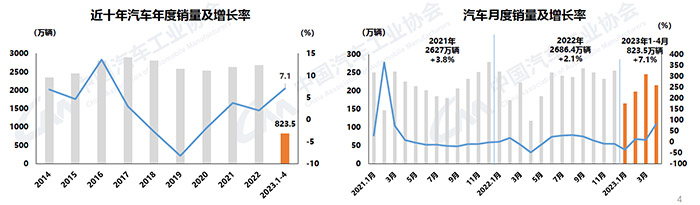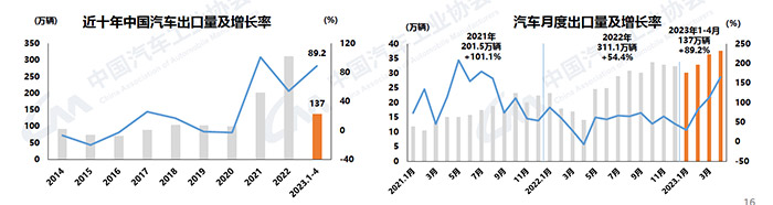 中新网5月11日电 (中新财经 葛成)11日,中汽协发布汽车产销数据。2023年4月,汽车产销分别完成213.3万辆和215.9万辆,同比分别增长76.8%和82.7%;新能源汽车产销分别完成64万辆和63.6万辆,同比均增长1.1倍;汽车企业出口37.6万辆,同比增长1.7倍。