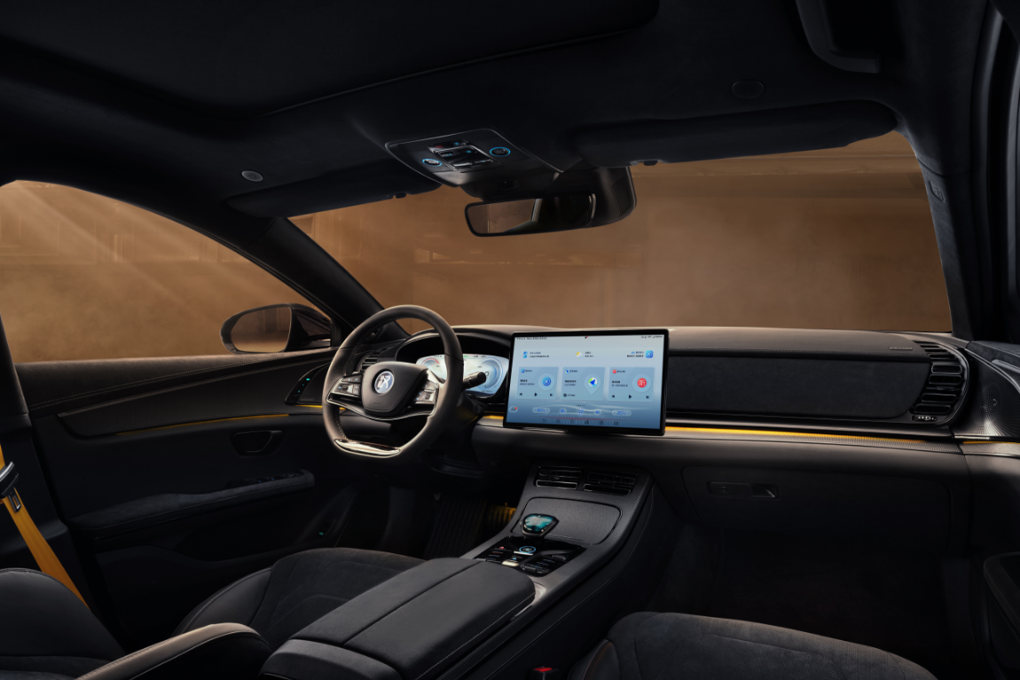 内外相融,汉DM-p战神版内饰加入了一系列的运动元素与高档用料,极黑高档类麂皮包覆座椅、门板、副驾面板、中控扶手箱等,并辅以黑色碳纤维材料点缀,同时配有一体式运动座椅、金甲黄安全带,整车内饰运动感潮奢升级,与个性外观、甲胄灵感配色相得益彰。