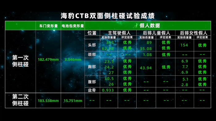 搭载CTB电池车身一体化技术的比亚迪海豹在TOP Safety双面侧柱碰试验中,挑战了主驾驶侧柱碰试验,副驾驶后排侧柱碰试验,以及两次侧柱碰后的电池包复用试验,顺利通过了挑战。