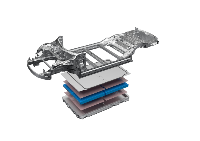 CTB技术以“电池车身一体化”为核心设计理念,并且在“蜂窝”中找到灵感,结合刀片电池独有的长方体结构和超级强度,衍生出“类蜂窝铝”结构,带来电池成组技术里程碑式的革新,通过将刀片电池包与车身刚性连接,二为一形成完整体,将地板(电芯上盖)-电芯-托盘三者与车身集成,形成高强度的“整车三明治”结构。