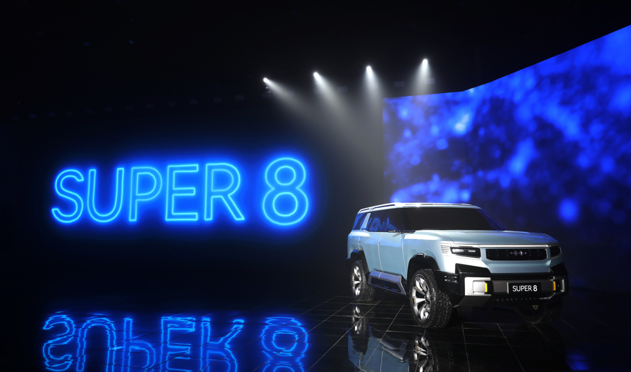 豹8车型的概念车SUPER 8,则展示了方程豹对硬派SUV的未来探索。SUPER 8在设计上不再拘泥于传统的方盒子设计,而是从科幻的未来战场获取灵感,将赛博工业美学与肌肉感相融合,营造出强壮、宽大的体量和高级、纯粹的车身形面;咬合式锁扣设计环绕整车,体现了底盘与车身的上下分体式连接,又展现出极强的结合性、稳固性与保护感,让用户自信驰骋、自由穿越、自在征服。