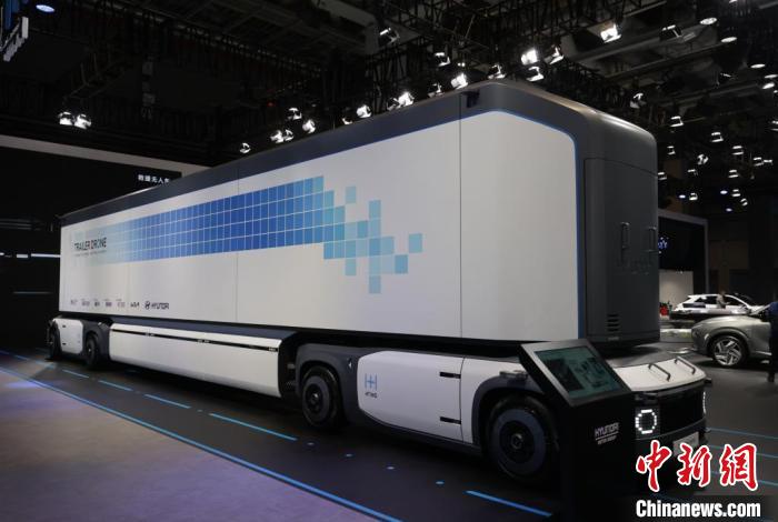 11月5日,第四届中国国际进口博览会在国家会展中心(上海)举行。汽车展区吸引众多企业前来参展。图为现代汽车展区展示新能源技术产品——氢动智能无人运输车。中新社记者 杨可佳 摄