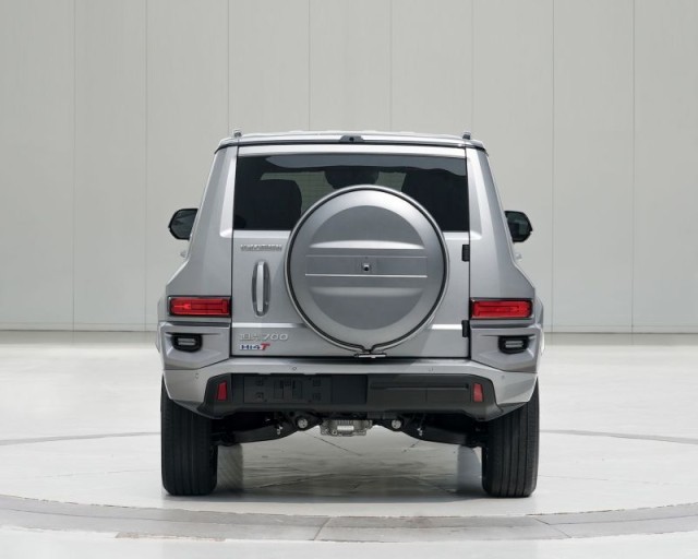 相比于前脸设计,坦克700 Hi4-T的侧面造型并没有采用复杂的设计,看上去较为方正。车尾部分,与很多硬派越野车一样,坦克700也背上了“小书包”,并采用了侧开启尾箱门的设计,使用起来应该非常方便。车身尺寸方面,新车长宽高分别为5090(5113)/2061/1952mm,轴距为3000mm。