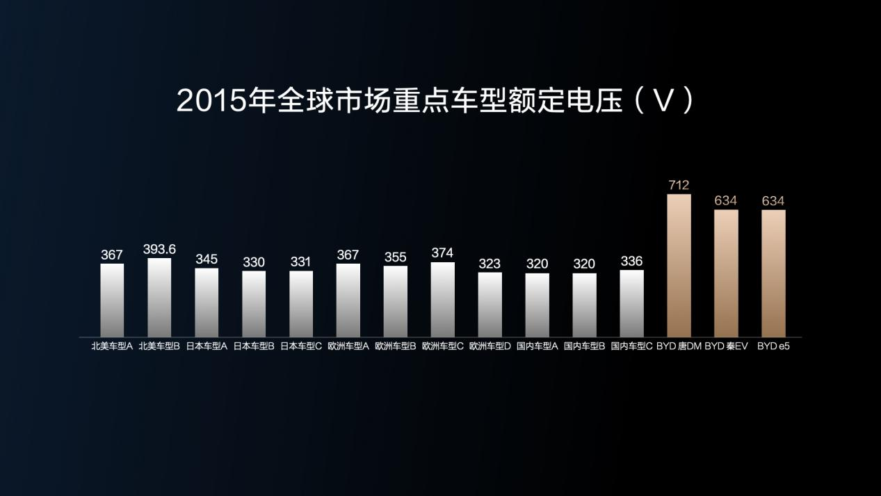 在新能源汽车普及初期,为了突破动力、续航、充电等方面的技术上限,给用户创造更极致的电动车体验,电动车高压化的技术突破势在必行。比亚迪率先在2015年实现突破,全球首创乘用车800V高电压平台,搭载在秦EV(2015款)、唐DM(2015款)等车型上。该技术可实现百公里加速快至4秒级,纯电续航里程可达450km、快充功率提升至60kW,全方面升维用户体验。比亚迪800V高电压平台超前行业2-3代,当时,市面上的乘用车都是低电压,只有比亚迪是高电压。时至今日,行业竞相进入800V高电压平台赛道。
