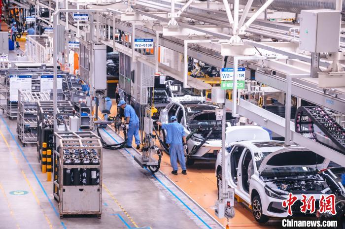 上汽集团乘用车宁德基地里,工人在新能源汽车生产线上作业繁忙。中新网记者 李南轩 摄