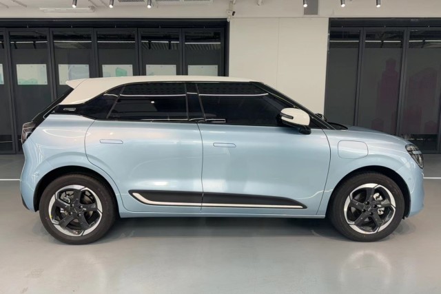 新车侧面造型较为紧凑,略微上扬的车侧腰线从车头一直贯穿延伸至尾部,搭配隐藏式车门把手及花瓣造型轮圈时尚感较强。与此同时, 东风纳米01还采用双色车身设计,并对A柱、B柱等处进行熏黑处理,营造出悬浮式车顶的视觉感受。车尾部分,两侧尾灯组造型设计较为圆润,结合车顶扰流板与熏黑后包围辨识度较强。