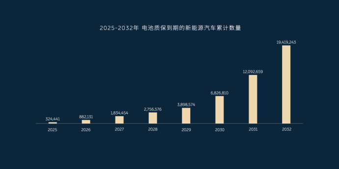 而此时距离2015年恰巧8年时间。蔚来汽车调查表示,2025到2032年,预计累计将有近2000万辆新能源车面临电池质保到期,动力电池将面临脱保的行业问题。