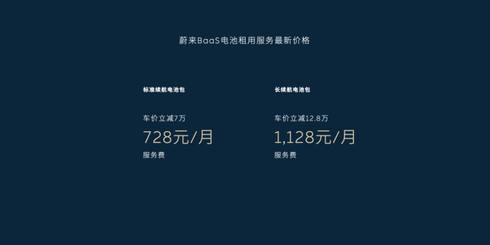 目前,蔚来还带来全新BaaS电池租用服务,标准续航电池包租用服务费从980元/月调整至728元/月,长续航电池包租用服务费从1680元/月调整至1128元/月,这被认为蔚来应对价格战的手段之一。