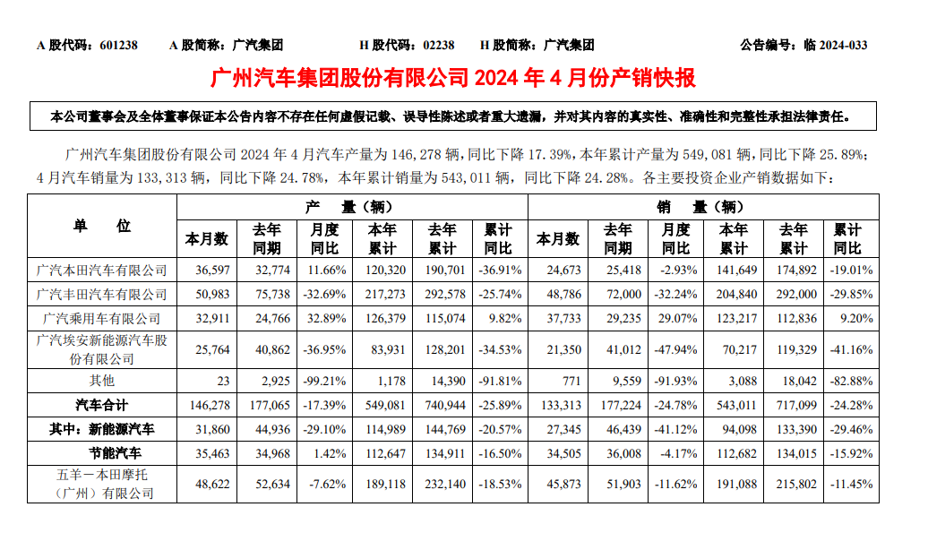 受广汽丰田持续下滑影响,广汽集团市场表现同样糟糕。根据广汽集团公布产销量快报显示,广汽集团前4个月累计销量为 543,011辆,同比下降 24.28%。
