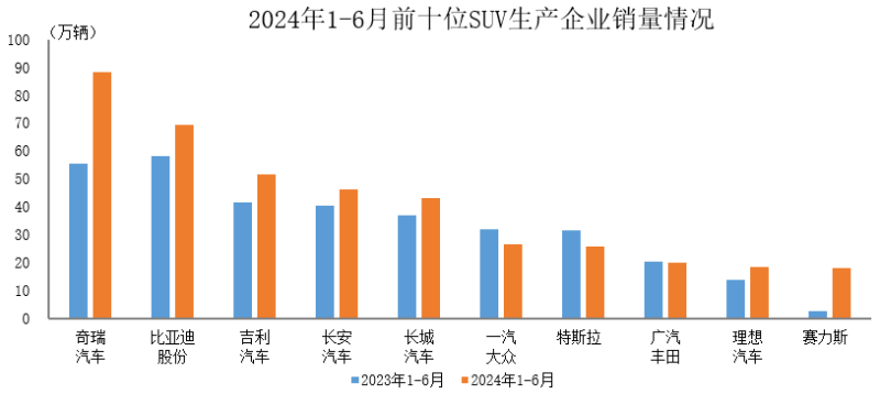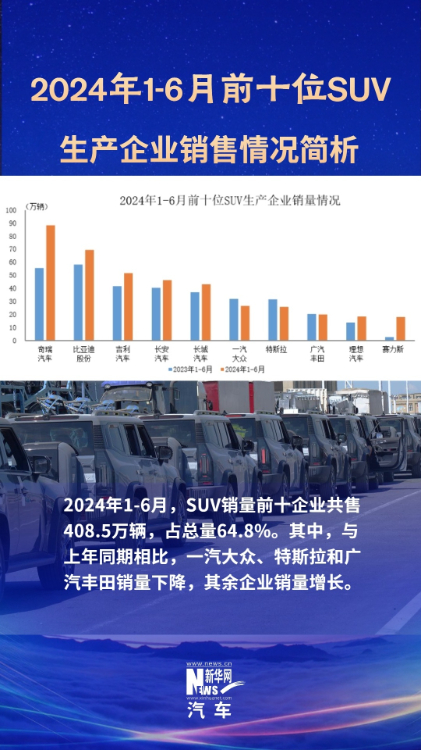 据中国汽车工业协会统计分析,2024年1-6月,销量排名前十位的SUV生产企业共销售408.5万辆,占SUV销售总量的64.8%。