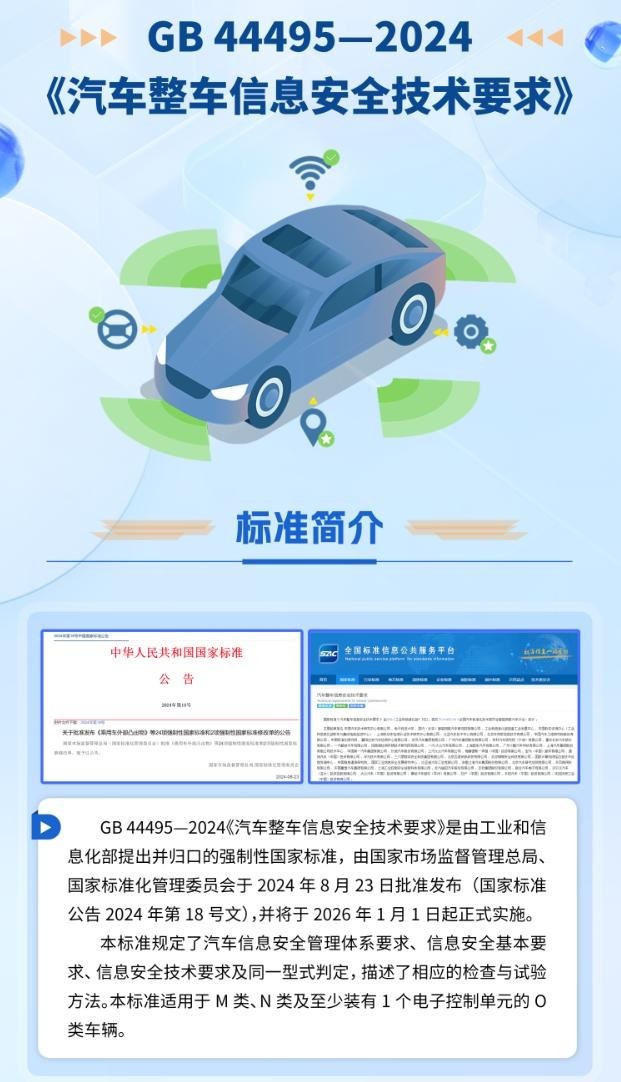 GB 44495—2024《汽车整车信息安全技术要求》规定了汽车信息安全管理体系要求,以及外部连接安全、通信安全、软件升级安全、数据安全等方面的技术要求和试验方法,适用于M类、N类及至少装有1个电子控制单元的O类车辆,对于提升我国汽车产品的信息安全防护技术水平、强化产业链风险防范和应对网络攻击的能力、筑牢汽车信息安全防护基线具有重要意义。