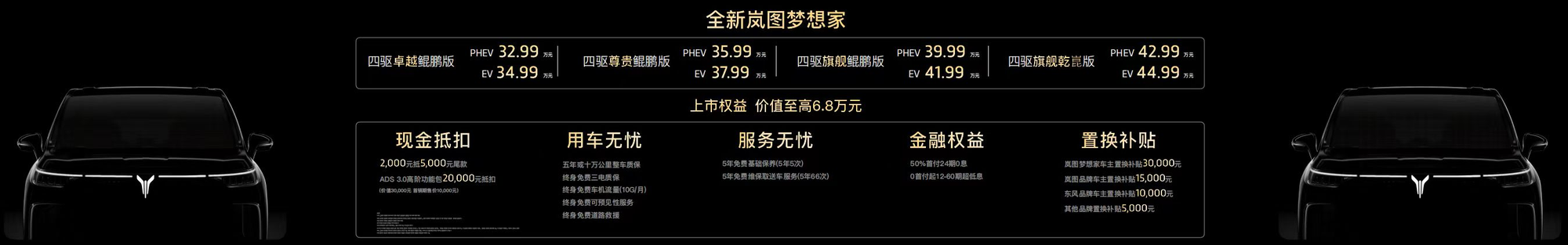 央广网北京9月20日消息(记者 姜鹏)9月19日,以“感恩相伴 梦想同行”为主题的东风汽车感恩6000万用户相伴暨全新岚图梦想家上市发布会于武汉成功举办,全新岚图梦想家正式上市并公布价格,其中,全新岚图梦想家四驱卓越鲲鹏版PHEV 32.99万元、EV 34.99万元;全新岚图梦想家四驱尊贵鲲鹏版PHEV 35.99万元、EV 37.99万元;全新岚图梦想家四驱旗舰鲲鹏版PHEV 39.99万元、EV 41.99万元;全新岚图梦想家四驱旗舰乾崑版PHEV 42.99万元、EV 44.99万元。同时,截至10月10日,岚图还为用户提供至高6.8万元的首销期专享权益,包含2千元抵5千元现金抵扣,原价3万首销期仅需1万元的ADS3.0高阶智驾包;此外还有用车无忧、服务无忧、0息金融等权益;针对换购的用户还有至高3万元的置换补贴。