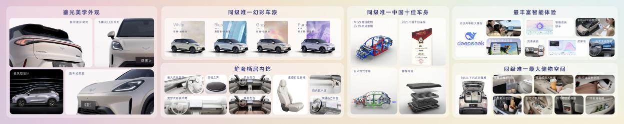 步入“舒屿座舱”,细节皆巧思。缤果S以“静奢栖居美学”为灵感,通过环抱式布局、贯穿式内嵌风幕与柔感贝壳座椅等设计,营造出沉浸式的舒适氛围。搭配同级唯一的6扬声器系统与阿嘉米斯专业声场调校,进一步提升了座舱的静谧质感与听觉享受。12.8英寸高清大屏内置“1+N”灵语AI中枢大模型,深度融合DeepSeek大模型,以更全面的壁纸玩法、八大区域的方言沟通、更多的智能场景应用,为用户带来真正“更懂你的”智能座舱体验。