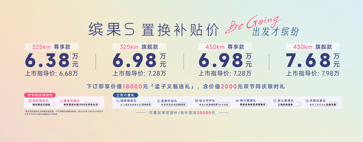 缤果S共推出325km尊享款、325km旗舰款、430km尊享款、430km旗舰款四款配置,上市指导价为6.68万-7.98万元,叠加置换政策可享置换补贴价6.38万-7.68万元,更可叠加享受至高20,000元的国家/地方购车补贴。