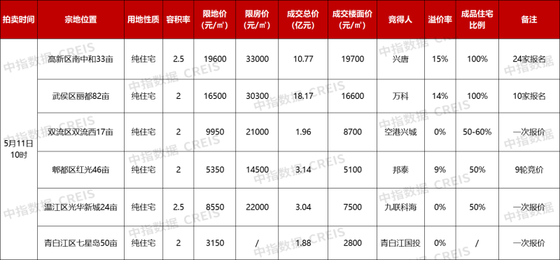 据中指研究院监测,本次出让中,只有2宗宅地位于主城区,其获得关注热度高、参拍企业多。最终,高新区南中和33亩宗地和武侯区丽都82亩宗地价格达到触顶“熔断”,分别由兴唐地产和万科以楼面价19700元/平方米、16600元/平方米摇中。