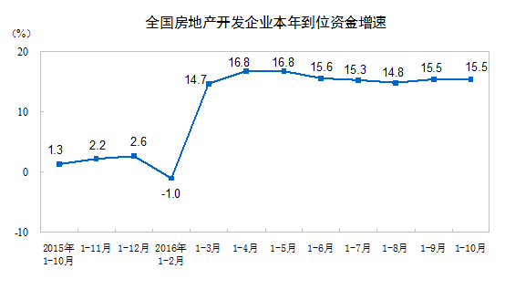 1-10月份,房地产开发企业到位资金117261亿元,同比增长15.5%,增速与1-9月份持平。其中,国内贷款17303亿元,增长1.2%;利用外资123亿元,下降49.0%;自筹资金40764亿元,增长0.6%;其他资金59071亿元,增长35.2%。在其他资金中,定金及预收款33655亿元,增长32.2%;个人按揭贷款19783亿元,增长51.5%。