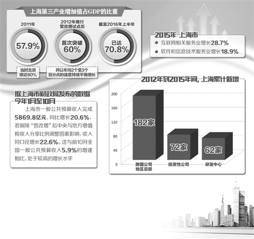 记者从上海市税务局了解到,2012年推行营改增试点后,第三产业占GDP比重首次突破60%,并以年均2个至3个百分点的速度持续平稳增长。截至2016年上半年,该比重已达70.8%。